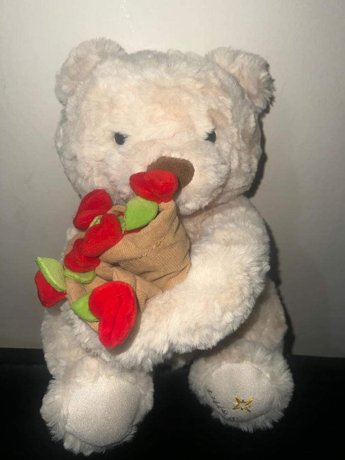 Tak! Miś ma w łapkach sprytne, niewidoczne magnesy, które pozwalają mu stabilnie trzymać różę lub inne drobne przedmioty. To właśnie ten detal robi największe „wow”.